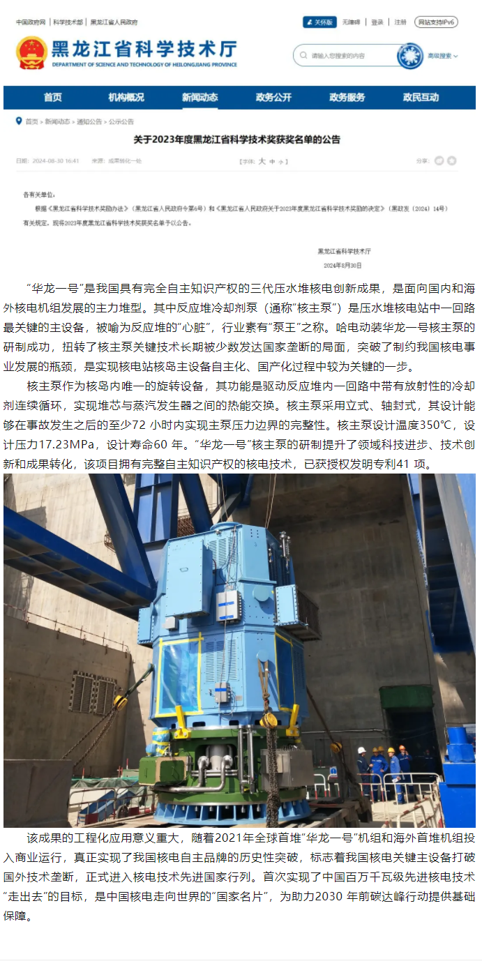 喜報!“‘華龍一號’反應(yīng)堆冷卻劑泵組研制及工程化應(yīng)用”榮獲黑龍江省科技成果轉(zhuǎn)化一等獎