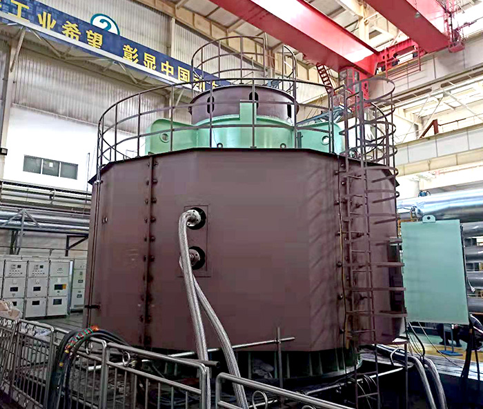 三門核電站海水循環(huán)水泵電機,額定功率7700kw,電壓等級10kV,工作轉(zhuǎn)速164r/min,電機極數(shù)為36極,最大設(shè)計推力為280噸,循泵電機整體重量為160噸,對設(shè)計、工藝、制造、檢驗均提出較高要求。此電機為目前立式異步電機,轉(zhuǎn)子采用鼠籠結(jié)構(gòu);上下機架采用探入式結(jié)構(gòu),降低整個泵組的高度,提高的循泵電機的穩(wěn)定性;全新開發(fā)了36極異步電機的槽配合,使得循泵電機具有較低的振動和噪音水平。三門核電循泵電機,擁有8項發(fā)明專利授權(quán),是擁有完全的自主知識產(chǎn)權(quán)的產(chǎn)品,利于AP1000和CAP1400核電站國內(nèi)建造和海外出口。目前,首臺循泵電機已經(jīng)順利通過型式試驗。